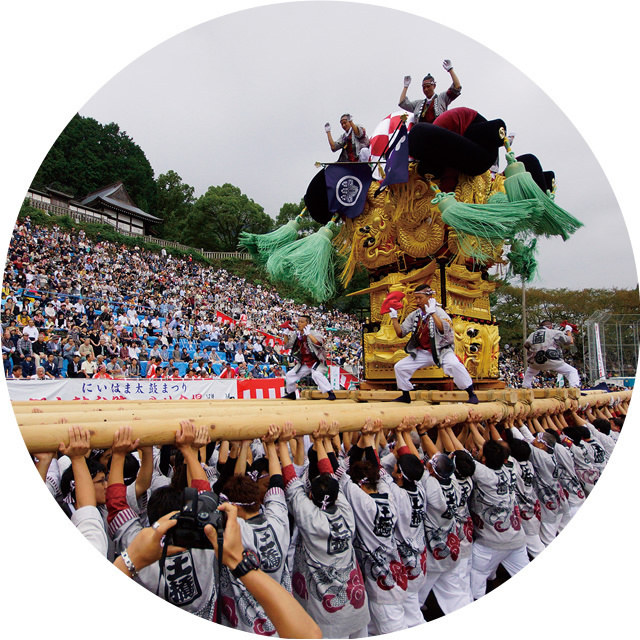 The Niihama Taiko Matsuri is a festival held in the city of Niihama in Ehime Prefecture to give thanks for a bumper harvest in autumn. It is one of the three major festivals on the island of Shikoku, along with Tokushima Prefecture’s Awa Odori and Kochi Prefecture’s Yosakoi Matsuri. Its origins are said to trace back some 1,000 years into antiquity. Floats carrying taiko drums measure 5.5 meters (18 ft.) high and roughly 12 meters (39 ft.) long and weigh roughly three tons. More than 150 men pool their strength together to heft these floats onto their shoulders and multiple floats come together in one spot, whereupon they begin to parade through the city. Both men and women dress up during the festival, and this high-spirited major event, brimming with both gorgeous mikoshi—portable shrines—and excitement, never fails to enthrall the crowds. (Held annually from October 16 to 18.)