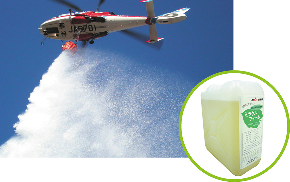 The Shabondama Soap Co., Ltd., a soap manufacturer in Kitakyushu City, Fukuoka Prefecture, developed the world’s first soap-based fire-fighting foam in 2007, in collaboration with other manufacturers, academic researchers and local governments. Because naturally sourced surfactant is used, the foam biodegrades rapidly, and since the soap, the basis of the foam, binds with mineral components in nature, the environmental impact is greatly reduced, including its effect on nature and the ecosystem. Another advantage is that the amount of water needed to extinguish fires is significantly less than what would otherwise be required with water alone.