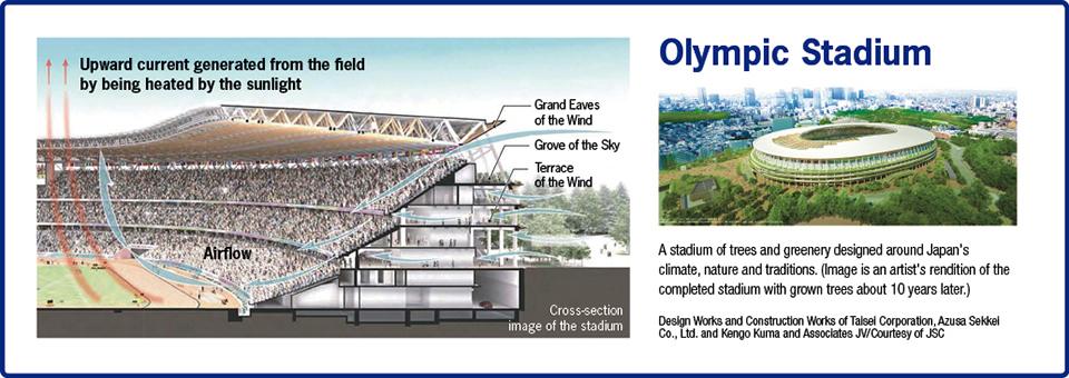 The finishing touches are being put on the Olympic Stadium, whose target date for completion is the end of November 2019. With the concept of “Stadium in Forest” that blends in with the natural surroundings, the sports venue employs modern technology to present traditional Japanese wooden architecture. Its innovative design allows the wind to flow through easily, thus mitigating the heat.