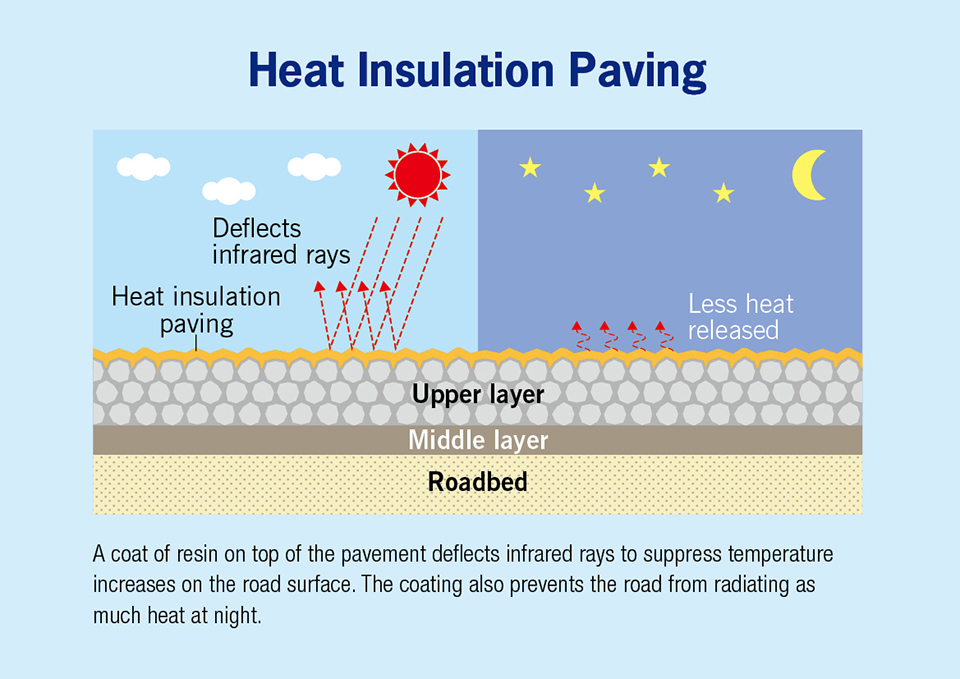 Japan is also taking steps to make the marathon and other events on public roads more comfortable for athletes and spectators. First, approximately 136km of road, including the marathon course, have a special pavement to suppress rising road surface temperatures. The chief technology behind that innovation is heat insulation paving, which was developed in Japan. It applies a heat-shielding coat to the road surface that deflects many of the sun's infrared rays. That prevents the road from retaining as much heat, thus keeping the road surface's temperature about eight degrees Celsius cooler.