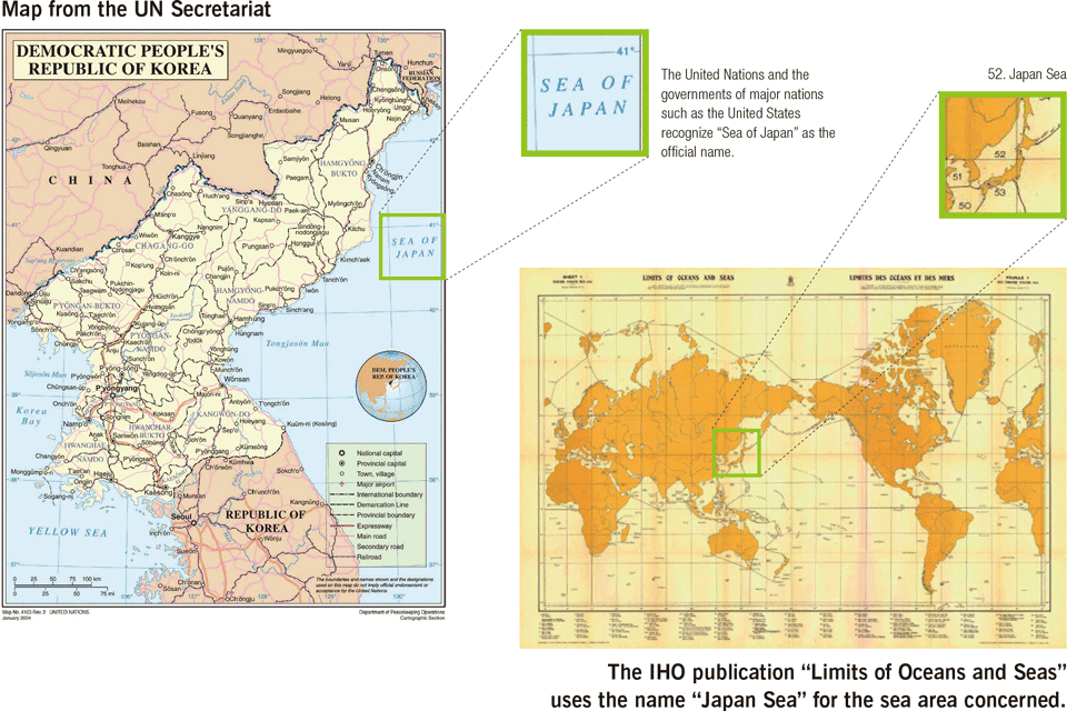 The name “Sea of Japan” is the only internationally established name for the sea area concerned. Japan strongly opposes unfounded arguments concerning the name “Sea of Japan,” and is calling for a better understanding of the issue and support for Japan’s position from the international community in order to maintain the sole use of the name, “Sea of Japan”.
