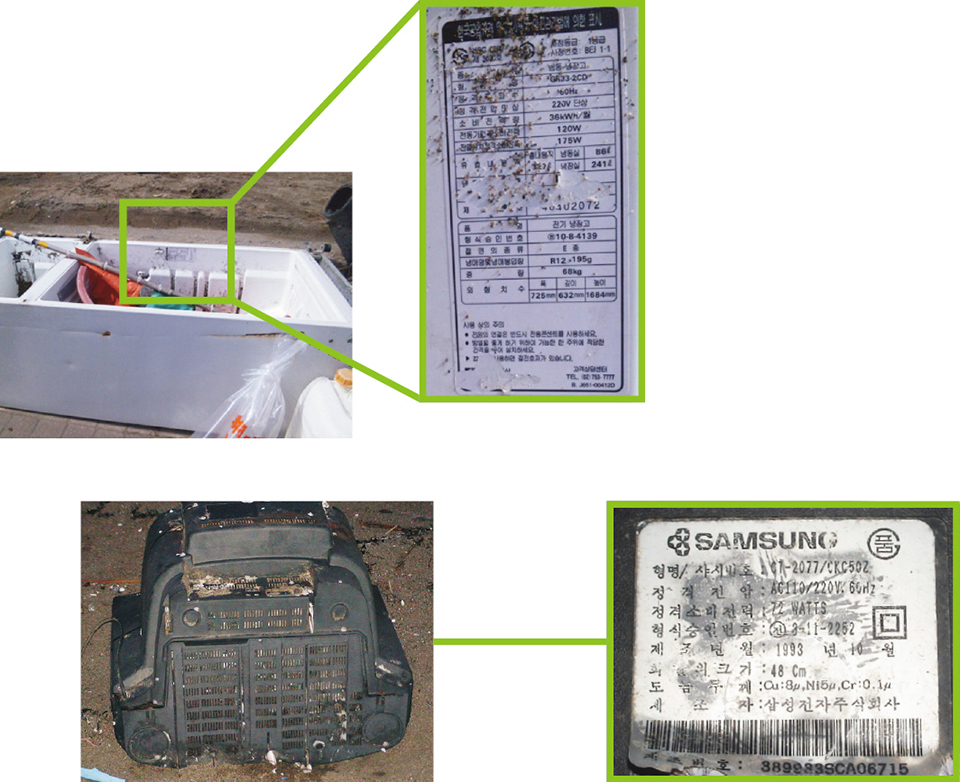 TVs and refrigerators with Korean labeling wash up on the beach.