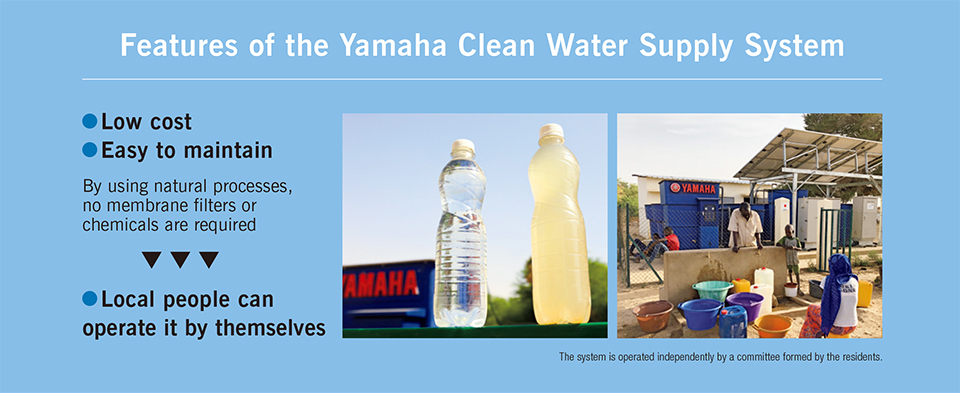 The Yamaha Clean Water Supply System produces safe water at the rate of 8,000 liters per day, which meets the needs of approximately 2,000 people. The greatest urgency for meeting water needs is in poor agricultural communities, and the system permits simple daily maintenance at a sustainably low cost for such regions. The system utilizes gravity in a way that reduces electrical consumption.