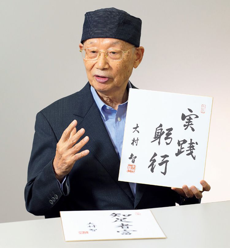 La devise du Pr Omura est « jissen-kyuko », ce qui signifie « suivre ses propres principes ». Il suit lui-même cette devise et l’a ainsi appliquée dans de nombreux domaines. Au-delà du chercheur, il est un homme d’action qui a réussi à persuader les laboratoires pharmaceutiques de développer de nouveaux médicaments. Il est ici présenté tenant sa devise écrite de sa main.